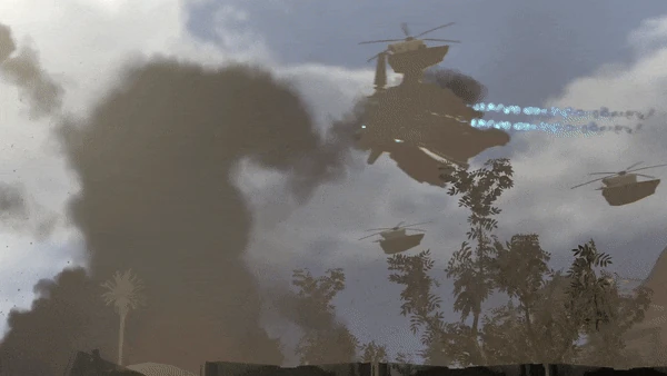 Десантный корабль Камераменов летит над полем битвы.