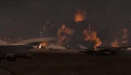 Изначально Импактор Астро Туалет сбивает Перевозчика Астро Туалета с курса, вызывая тряску из-за довольно мощного энергетического заряда. После он стреляет новым зарядом в раненых Перевозчика Скибиди Туалета и Обычного Камерамена, убивая их. | Убиты |