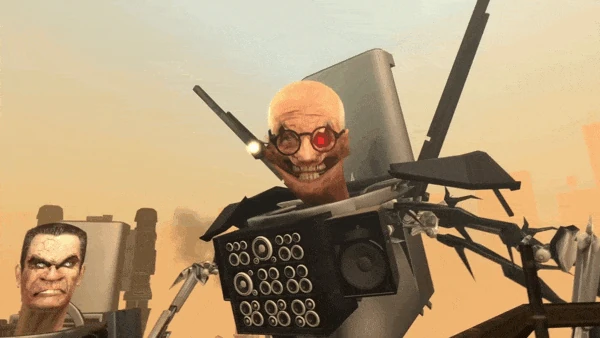 Титан Камерамен наводит указательный палец левой руки на него, а потом проводит большим пальцем левой руки по своей шее, намекая на то, что в этой битве учёный Скибиди Туалет не выживет.