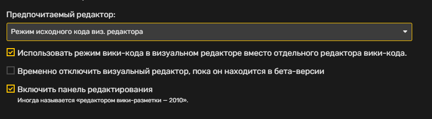 Настройки для удобного редактирования статей представлены ниже. Выберите Редактор исходного кода, вместо обычного Визуальный редактор. Последний не рекомендуется, так как он не умеет работать с шаблонами. Перейдите по ссылке и выберете соответствующие настройки.