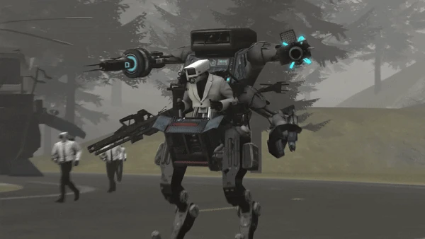 Камерамен в красном галстуке (POV) смотрит на прибывшего Учёного Камерамена 1337, который теперь снаряжён личным меха-роботом. Протагонист показывает большой палец вверх, одобрительно кивая.