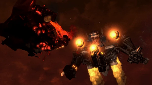 Справа посередине POV-Камерамен слышит звуки варп-двигателя Астро Туалетов, которые становятся всё громче. Он оборачивается в сторону и видит с помехами, как схватившиеся своими руками Джаггернаут и G-Туалет падают на землю с невероятной скоростью, причём G-Туалет находится выше своего оппонента. Враги раскручиваются, G-Туалет оказывается слева для оператора и взлетает, отталкиваемый Джаггернаутом, который наносит сопернику удар правой рукой, а Скибидист немного закрывается левой, сгибая и поднося ближе локоть к голове. Астро Туалет произносит: WHAT FOR THIS FIGHT? (ЧЕГО РАДИ ЭТО СРАЖЕНИЕ?). Находящийся и летящий с помощью огня из реактивного ранца слева для оператора G-Туалет раскидывает свои механические руки в стороны и отвечает со спокойным и удивительно добрым лицом, глядящим на бывшего союзника: You tell me ;) (Ты мне поведай ;)). Камера прокручивается уже влево от летящего спокойного G-Туалета с жёлтым огнём из рук, крутящимся по часовой стрелке ядром и горящими джетпаками к надменно ведущему себя Джаггернауту, поднимающему левую руку с крутящейся кистью и продолжающему: ACCEPT YOUR DEFEAT WITH AN HONOR... IF YOU STILL HAVE IT! (ПРИМИ СВОЕ ПОРАЖЕНИЕ С ЧЕСТЬЮ... ЕСЛИ ОНА У ТЕБЯ ЕЩЕ ЕСТЬ!). Камера крутится вправо на G-Туалета, который немного отлетел влево и подальше от Джаггернаута. У Скибиди Туалета непонимающее лицо с небольшой ноткой злобы, и, похоже, Командир с руками опущенными и развёрнутыми вбок лишь так играет с Астро Туалетом. Он отвечает ему: Why such hostillity? Did you forget how we conquered the worlds together? For me, you were always like brother... For them... an expandable pawn! (Откуда такая враждебность? Ты забыл, как мы вместе покоряли миры? Для меня ты всегда был как брат... А для них... разменной пешкой!). Перед словосочетанием о покорении миров Джи-Туалет опускает руки, а затем поднимает их вверх, сгибает в локтях и кистях, механизмы издают щёлкающий звук, сам герой смотрит на правую, затем на левую руку, после щелчка выпрямляет шею и поднимает верхнюю губу, обнажая зубы и убирая данную ухмылку. Далее он опускает руки, продолжая речь, лазеры на плечах и в руках активно вращаются. Перед словами «разменная пешка» Туалет поднимает правую руку и пальцем указывает на Джаггернаута, будучи с серьёзным лицом. Далее он опускает руку и качает головой влево и резко её возвращает на место.