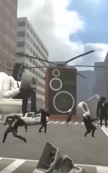 Видно, что Альянс доминирует в войне, захватывая город. Уже многие улицы переходят под контроль Альянса, ведь трупов Камераменов или Спикерменов практически нет, а пустые унитазы буквально повсюду. Чтобы поставить противников на место, Мафия Скибиди Туалет решает отправить глитча Скибиди Туалета, с которым он переговаривался в прошлом эпизоде.